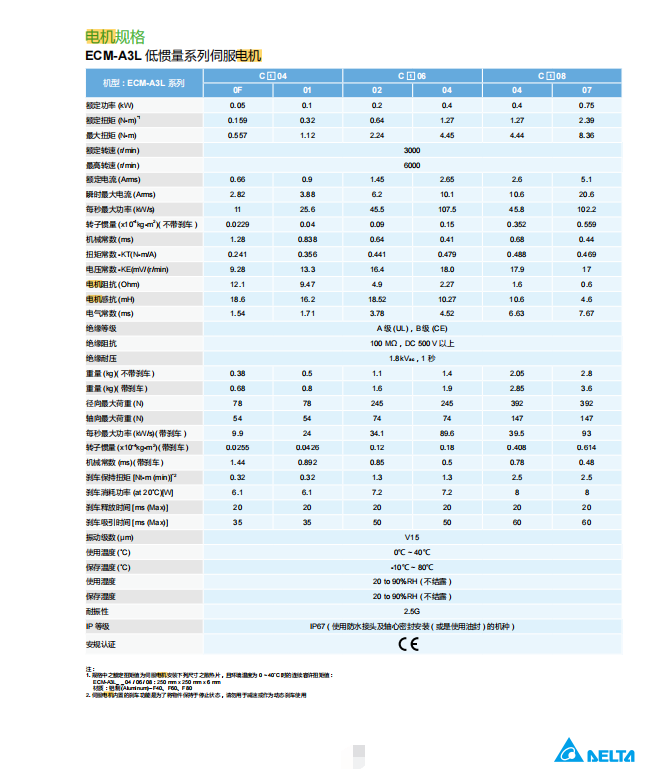 ? ? ?? ECM-A3 系列電機(jī)為高精度泛用型永磁式交流伺服電機(jī),搭配 200 ~ 230 V 交流伺服驅(qū)動(dòng)器 ASDA-A3 220 V系列,其功率范圍由 50 W 到 750 W。電機(jī)框號(hào)有 40 mm、60 mm 、80 mm 三種尺寸,提供 ECM-A3H 高慣量和 ECM-A3L 低慣量機(jī)種,額定轉(zhuǎn)速 3000 r/min,最大轉(zhuǎn)速 6000 r/min,ECM-A3H 最大扭矩范圍為0.557 N-m 到 8.36 N-m ,ECM-A3L 最大扭矩范圍為 0.557 N-m 到 8.36 N-m。